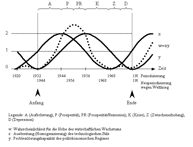 Phasenverschobene Zyklen der Ausbreitung des technologischen Stils und der Problemlösungskapazität des politökonomischen Regimes sowie die resultierende Wahrscheinlichkeit der wirtschaftlichen Expansion21