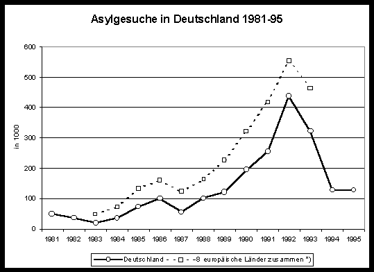 Selbst in absoluten Zahlen gemessen machten die Flüchtlinge allerdings nur einen relativ geringen Anteil an der Gesamtbevölkerung (1992: 0.05%) oder der ausländischen Bevölkerung (1992: 6.7%) aus. Der Teil der Flüchtlinge, der die Kurve zu Beginn der 1990er Jahre so stark ansteigen liess, stammte zudem aus den Kriegsgebieten um Ex-Jugoslawien und wurde kurz darauf auch wieder rigoros zurückgeschickt.163 Deutschland nimmt in Europa im Asylbereich eine einzigartige Stellung ein, denn in Deutschland fallen mehr Asylgesuche an als in allen anderen europäischen Staaten zusammen. Die Entwicklung der Asylgesuche in Deutschland entspricht im Wesentlichen der gesamteuropäischen Entwicklung.